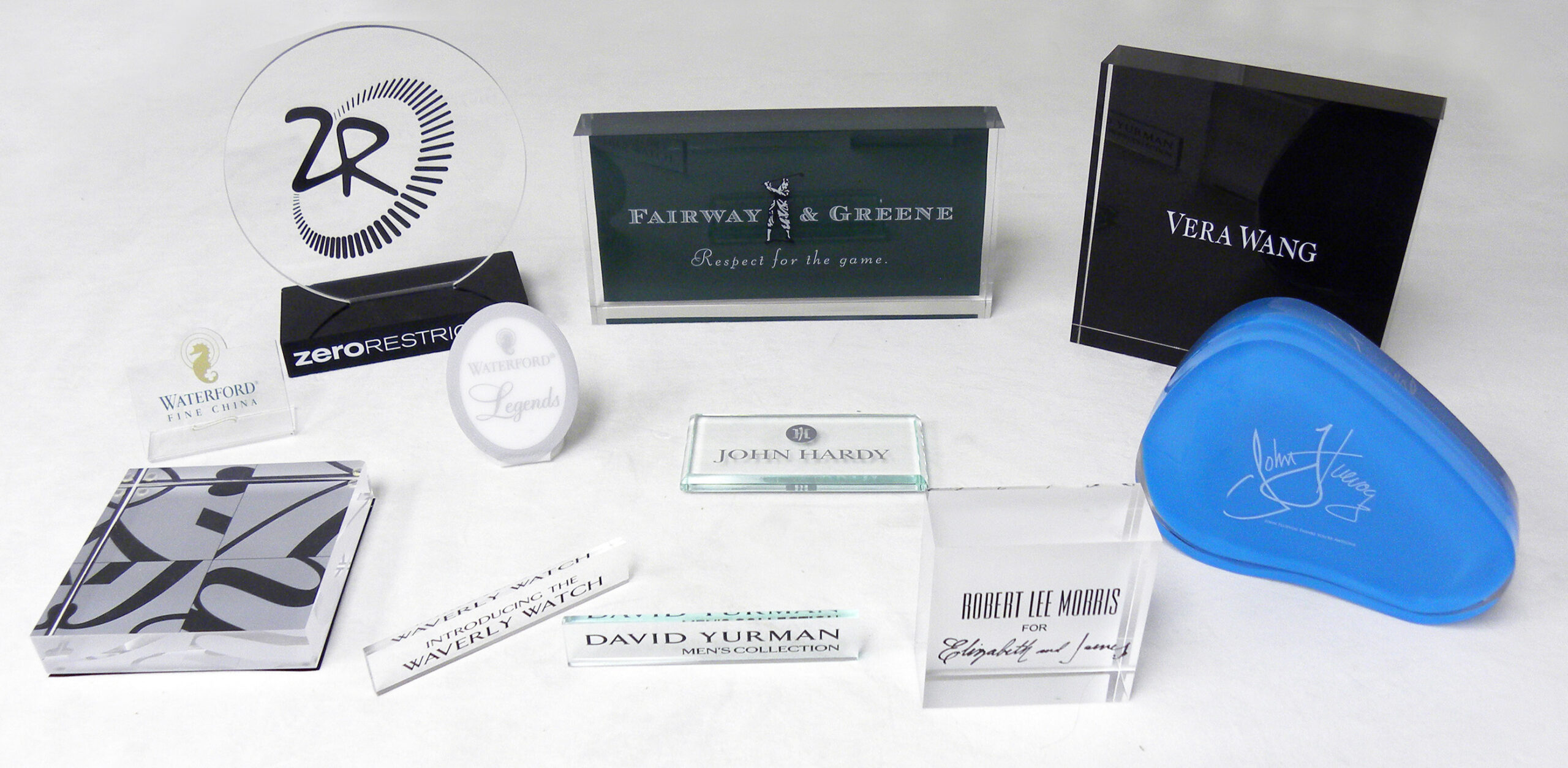 - Acrylic sign blocks & display signs — clear and colored acrylic sign fabrications for countertop, shelf, and fixture-mounted applications